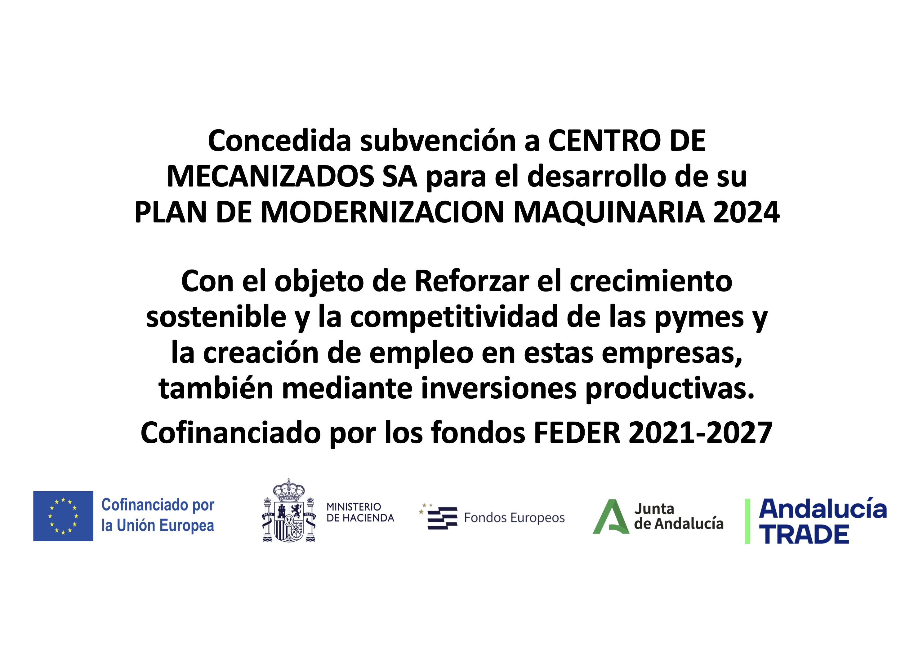 Concedida subvención a CENTRO DE MECANIZADOS SA para el desarrollo de su PLAN DE MODERNIZACION MAQUINARIA 2024. Con el objeto de Reforzar el crecimiento sostenible y la competitividad de las pymes y la creación de empleo en estas empresas, también mediante inversiones productivas. Cofinanciado por los fondos FEDER 2021-2027